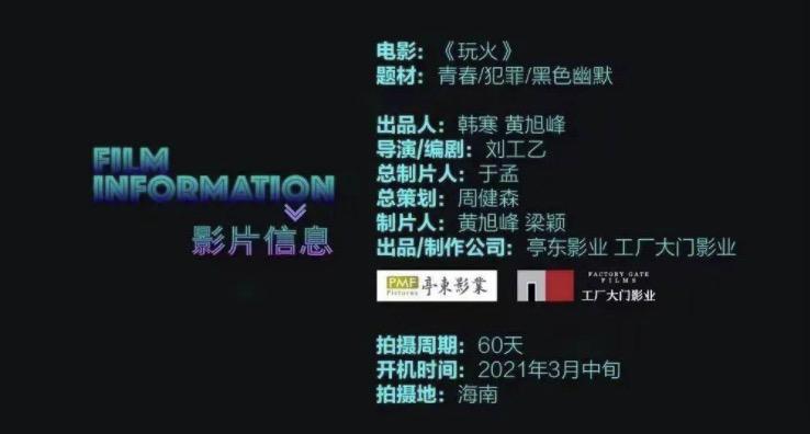 目前唯一可查的作品,是韩寒作为出品人与工厂大门影业合作的青春犯罪类电影《玩火》,预计将在2021年3月中旬开机。