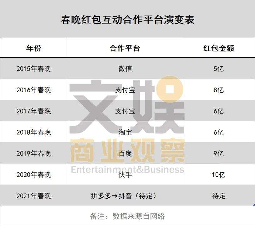 从2015年开始,众多互联网公司纷纷相中春晚红包合作伙伴的这一角色,从全领域激烈交锋的BAT三巨头,到叱咤大小荧屏的短视频双雄,春晚舞台上的红包使者无形中化作成时代的缩影,而给观众发红包也成为了它们在年终的最后一场冲刺。