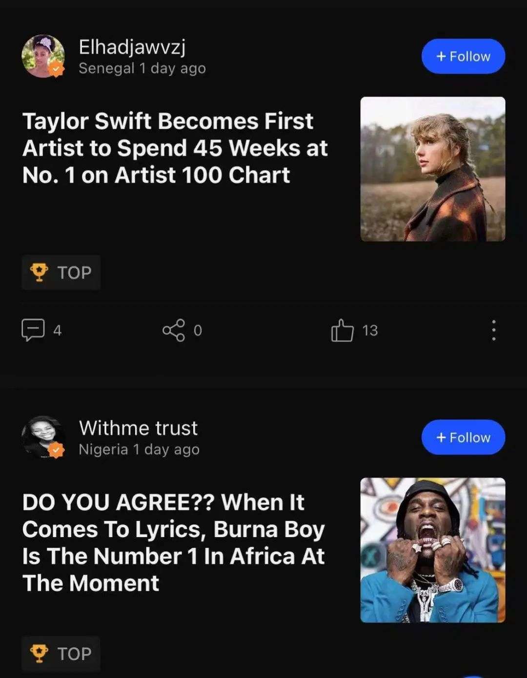 版权只是第一步,社区运营才是长期壁垒。网易云虽然在国内被戏称为是网抑云,但社区运营水平确实是一流。现在打开Boomplay社区的文字区,也开始体现出一股浓浓的非洲“网抑云+虎扑”的味道。
