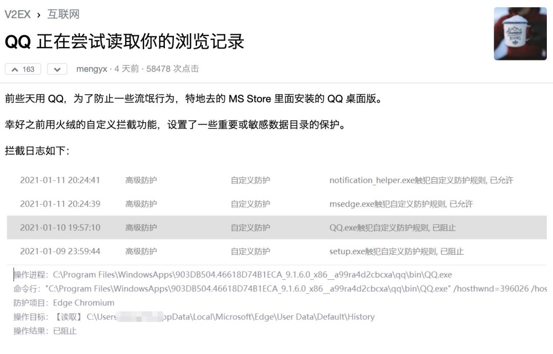 1月15日,知名开发者社区V2EX出现了一篇帖子,发帖人@mengyx表示,电脑上装载的安全软件“火绒”拦下了QQ的读取操作,而QQ的读取目标,竟然是Edge浏览器的历史记录。