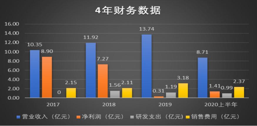在出海的拉动下,英雄互娱在国内承压情况下,仍取得营收稳定正增长。2017年-2019年公司营业收入分别为10.35亿元、11.92亿元、13.74亿元,复合年均增长率为9.9%。公司稳定的营业收入增长也保持到2020年,2020年上半年公司营收收入为8.71亿元。2018-2019年公司受行业对游戏牌号停发政策影响,2018年净利润7.27亿元急剧下滑至2019年净利润0.31亿元;然而到2019后半年游戏牌号发放逐渐恢复正常,公司2020年上半年净利润也回升至1.41亿元。