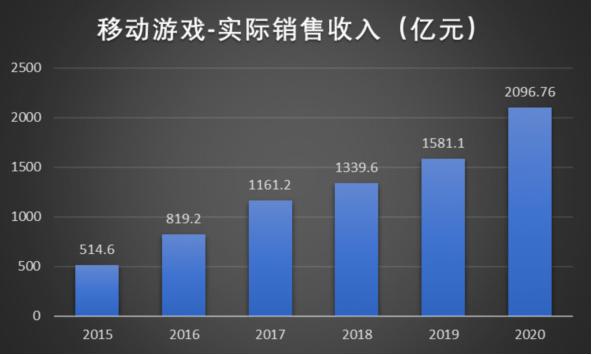 目前,移动游戏的天花板还很高。移动游戏行业收入规模从2015年的514.6亿元飙升至2019年1581.1亿元,复合年均增长率为25.17%;2020年移动游戏收入规模也进一步升至2096.76亿元,占游戏市场总收入的75.24%。