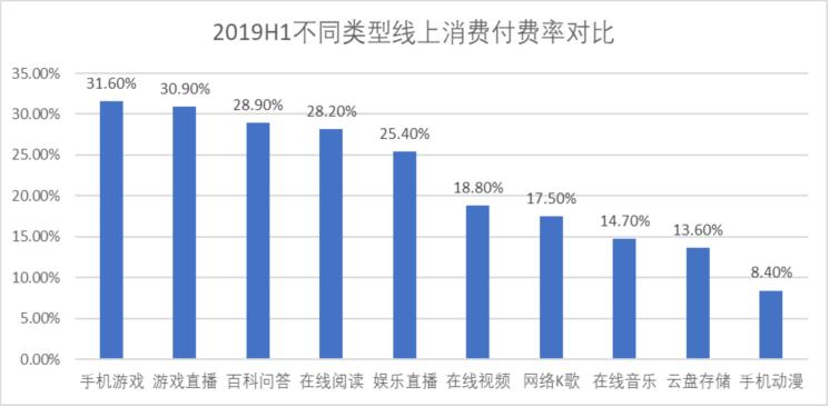 根据2019年H1不同类型线上付费率对比来看,手机游戏付费率以31.60%占比作为线上付费率最高的消费产品。由此可见,移动游戏为游戏行业规模最大的细分市场,同时高水平的人均付费率是移动游戏保持高速增长的主要因素。