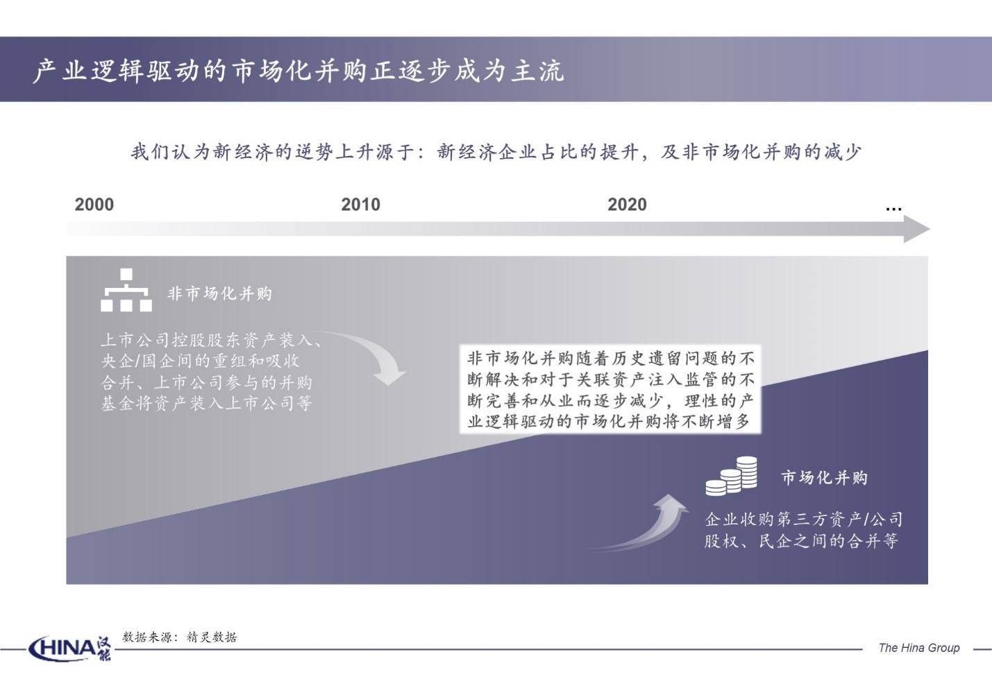 由于中国经济整体上具有“新兴+转轨”的特点,在并不太长的中国现代资本市场史历程中,出现的并购大体可划分为两大类:非市场化并购和市场化并购。非市场化并购多为解决一些历史遗留问题,例如国企大股东注入资产、解决同业竞争,或上市公司并购基金将资产装入上市公司等。随着历史遗留问题的不断解决以及资本市场制度的不断完善,这些非市场化并购的业务存量机会正在慢慢下降。而通过市场化并购做大规模、或向产业链上下游延伸、或在相邻产业进行布局的产业逻辑驱动的并购正逐步走向舞台中央。