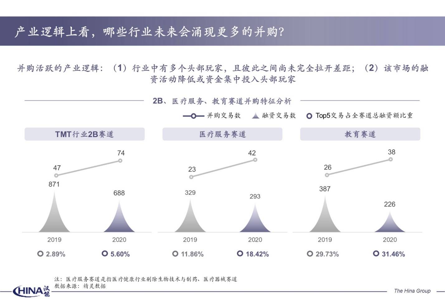 后一个特征使得融不到资的企业开始考虑出售机会(供给侧),如: 2020年2B、医疗服务、教育赛道融资额下滑、头部吸金能力提升,并购交易数显著上升。