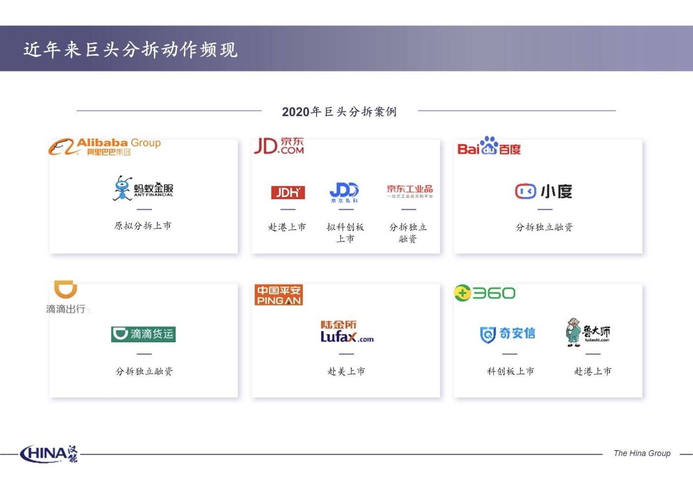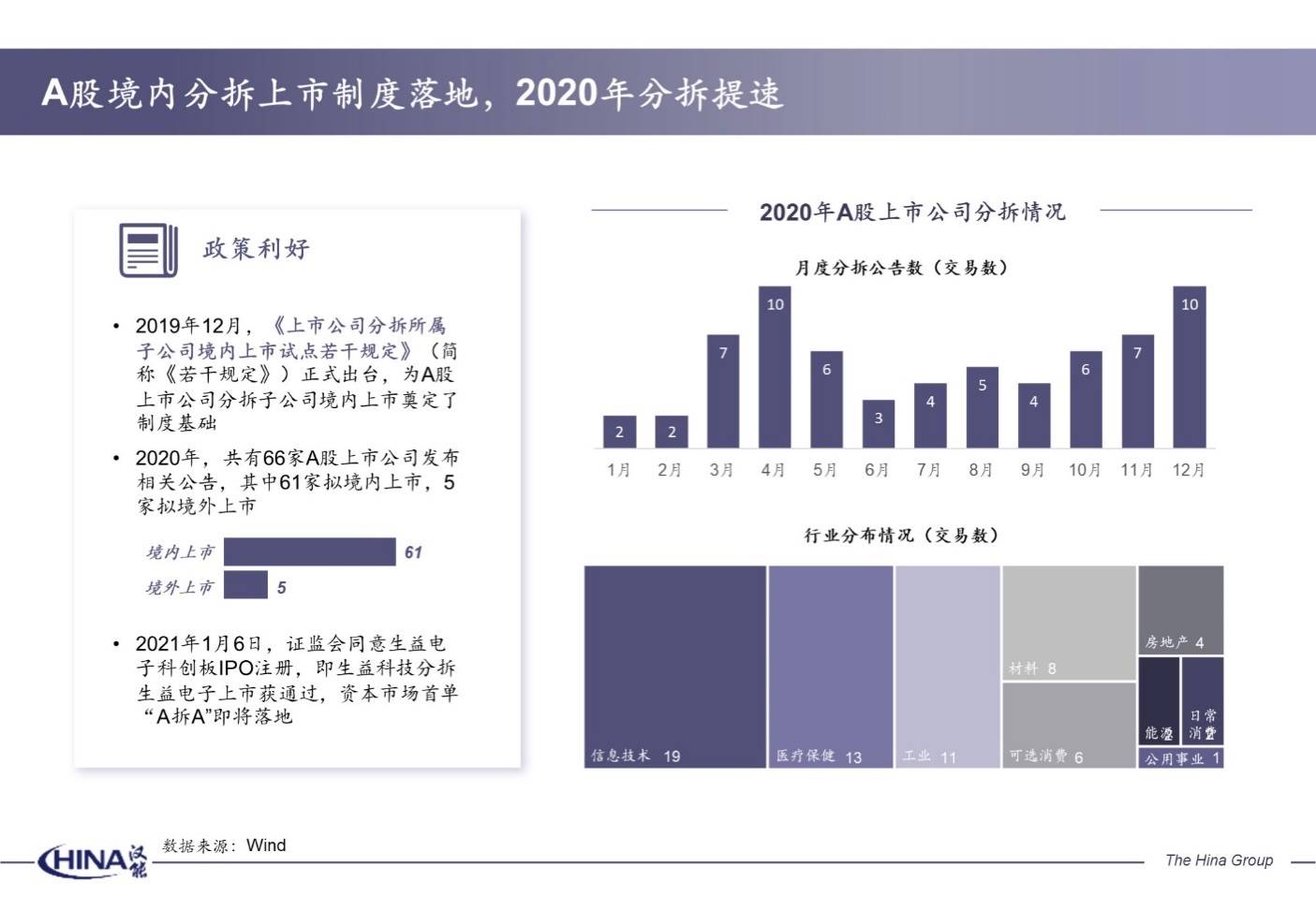 2019年12月,《上市公司分拆所属子公司境内上市试点若干规定》(简称《若干规定》)正式出台,为A股上市公司分拆子公司境内上市奠定了制度基础,2020年已有逾60家A股上市公司发布相关公告。此外,近几年新经济巨头分拆交易频现,仅2020年便有百度分拆小度科技并独立融资20亿元人民币、京东分拆京东工业品并与工品汇合并、京东分拆京东健康并实现35亿美元香港IPO等多个明星案例。