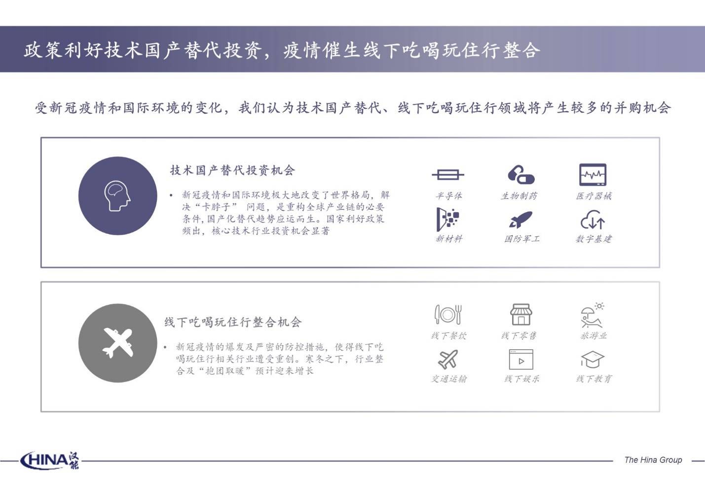 从宏观环境因素上看,2020年新冠疫情和国际政治经济环境变化的影响也会催生并购整合机会。一方面,国产替代化趋势兴起,高精尖核心技术行业将持续吸引资本目光,预计出现较多投资、并购机会;另一方面,疫情中线下教育、餐饮、消费、文娱旅游、交通运输等行业严重承压,存在较多行业整合机会。