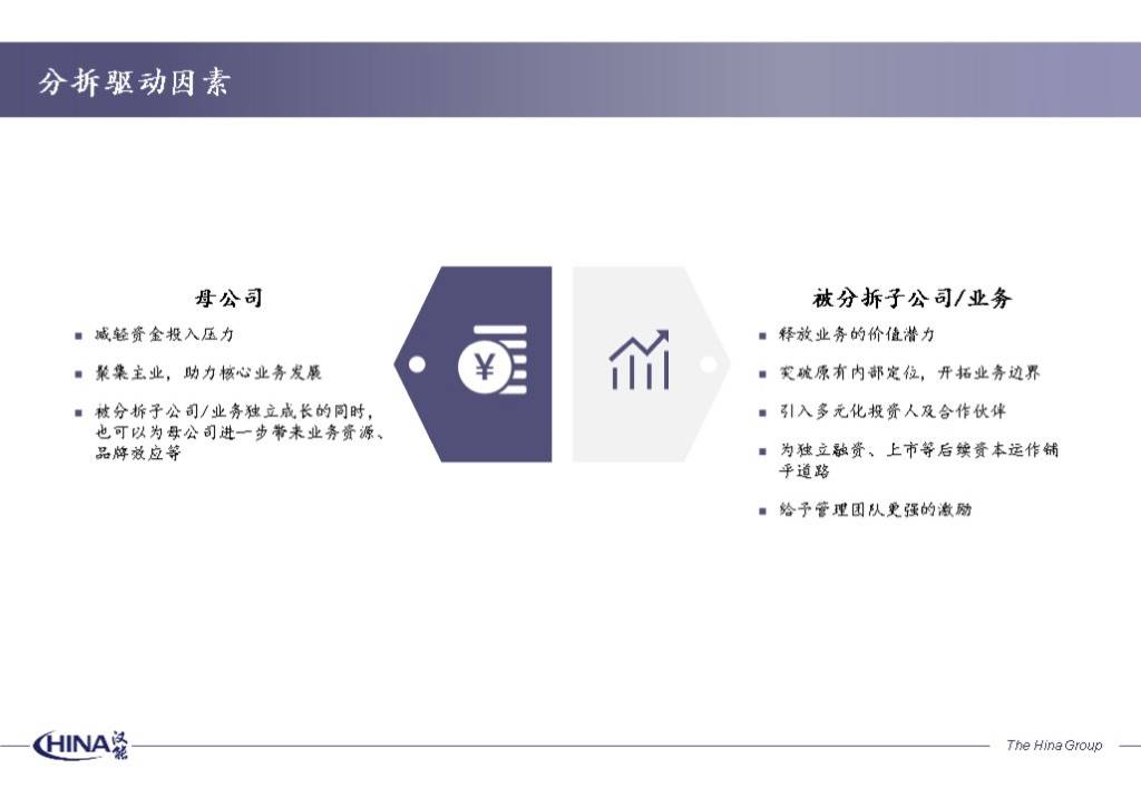 分拆子公司/业务可减轻母公司持续投入的资金压力,使其聚焦核心主业;子公司通常可获得更高的业务价值及自由度,并可引入多元化的投资人及合作伙伴,开启新的资本征程;而子公司的壮大可进一步为母公司带来业务资源及品牌效应。