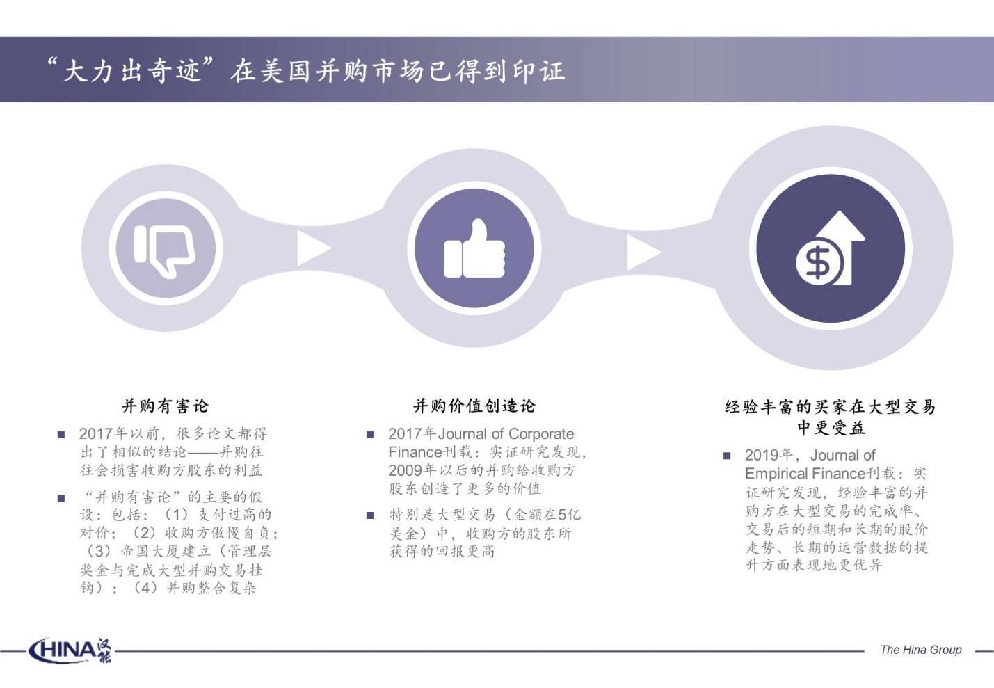 由于过往的中企跨境并购项目有些因“判断失误”、“消化不良”加之动用了过高的杠杆,导致收购完成后,拖累了财务表现,开始考虑“卖卖卖”,同时因过去两年的上市公司的商誉“减值潮”,使得资本市场开始对并购,特别是大型并购“谈虎色变”,并对并购所能创造的价值愈发质疑。并购对收购方所能带来的价值一直是业界学者喜爱通过实证论文探讨的方向,而我们发现2017年以后,顶级金融期刊陆续刊登了学者论文,通过实证论证了“大力出奇迹”。