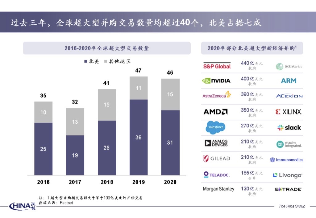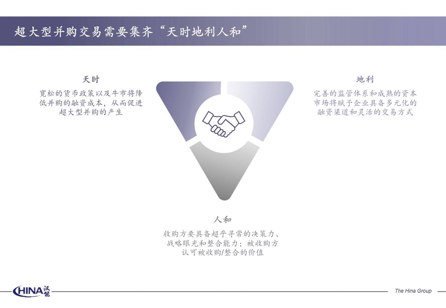 纵使疫情持续在全球蔓延,海外超大型并购仍如火如荼,且头部超大型并购交易绝大多数为新经济领域。而中国新经济并购则仍在“小步快跑”阶段。我们认为超大型并购的稳定出现可以作为一个成熟的并购市场的标志之一,需要集齐“天时地利人和”。