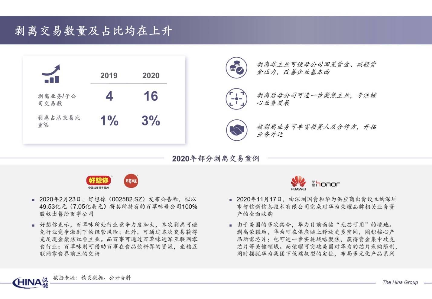 2020年,随着相关制度的落地,A股上市公司拉开了“分拆潮”。新经济领域也涌现了多个分拆/剥离交易。我们预计,随着实操案例上升和制度保障的落地,以及IPO市场的持续繁荣,分拆独立融资/上市将持续出现。而平台经济的反垄断指南对分拆和剥离的影响有待于进一步观察。