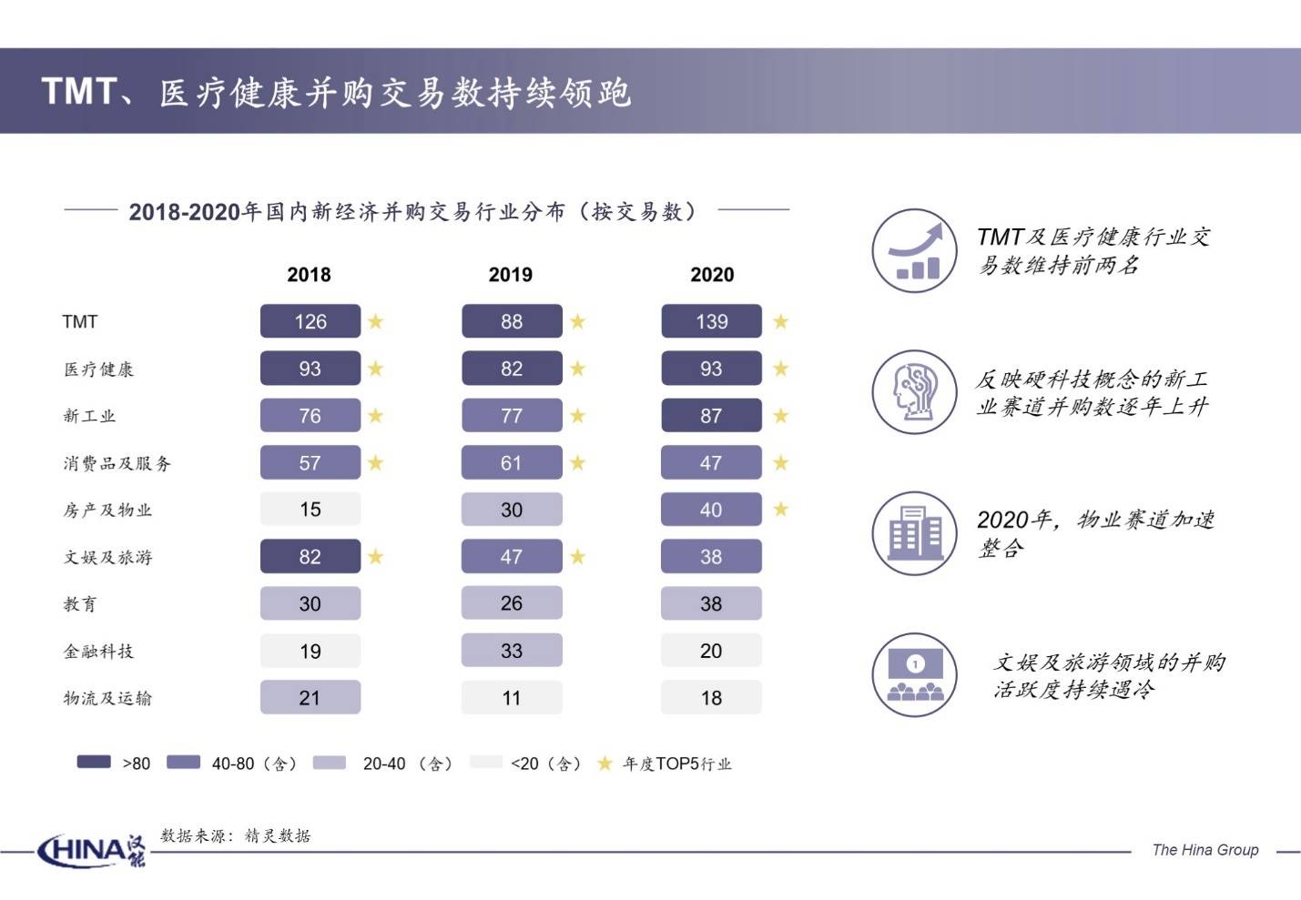 逐步放缓的GDP增速、注册制下愈发通畅的发行及退市制度、非市场化并购存量的清退,使得产业驱动的市场化并购占比上升。新经济作为市场化并购中的重要力量,长期将持续价量齐升。此外,由于疫情对交易的推迟效应,我们预计2021年国内新经济并购市场将继续向好,延续2020年四季度高活跃度的势头。就行业活跃度而言,我们预期2021年TMT和医疗将持续领先,线下消费、文旅、教育赛道或因疫情开始加速整合。