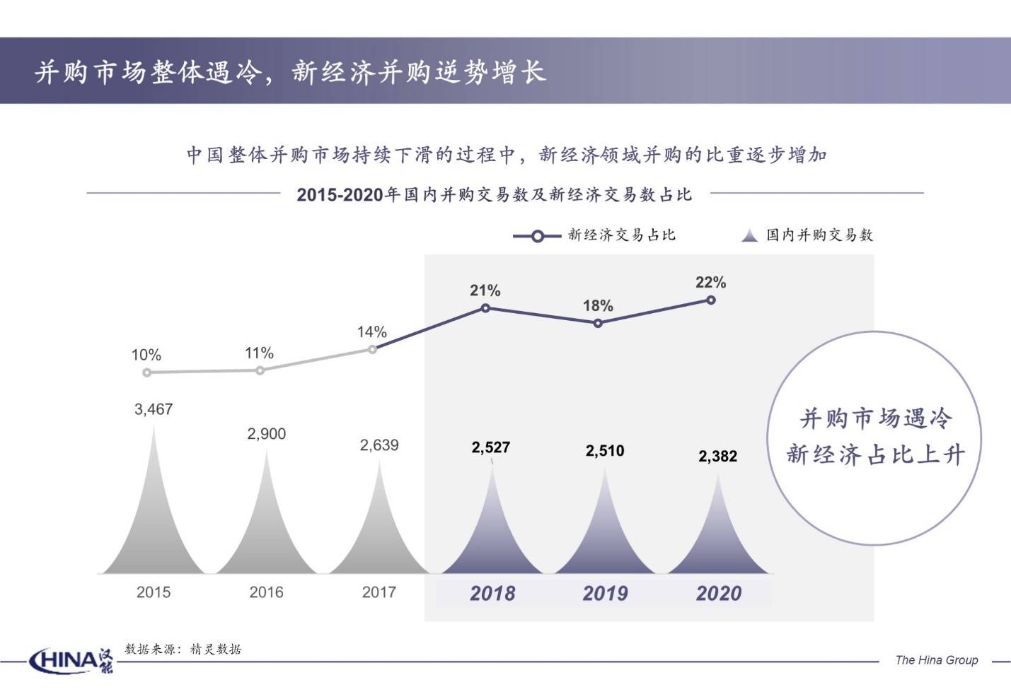 自2015年高峰算起,在中国整体并购交易数持续下滑的过程中,新经济领域并购的比重逐步增加,成为整体逆势中的一个亮点。