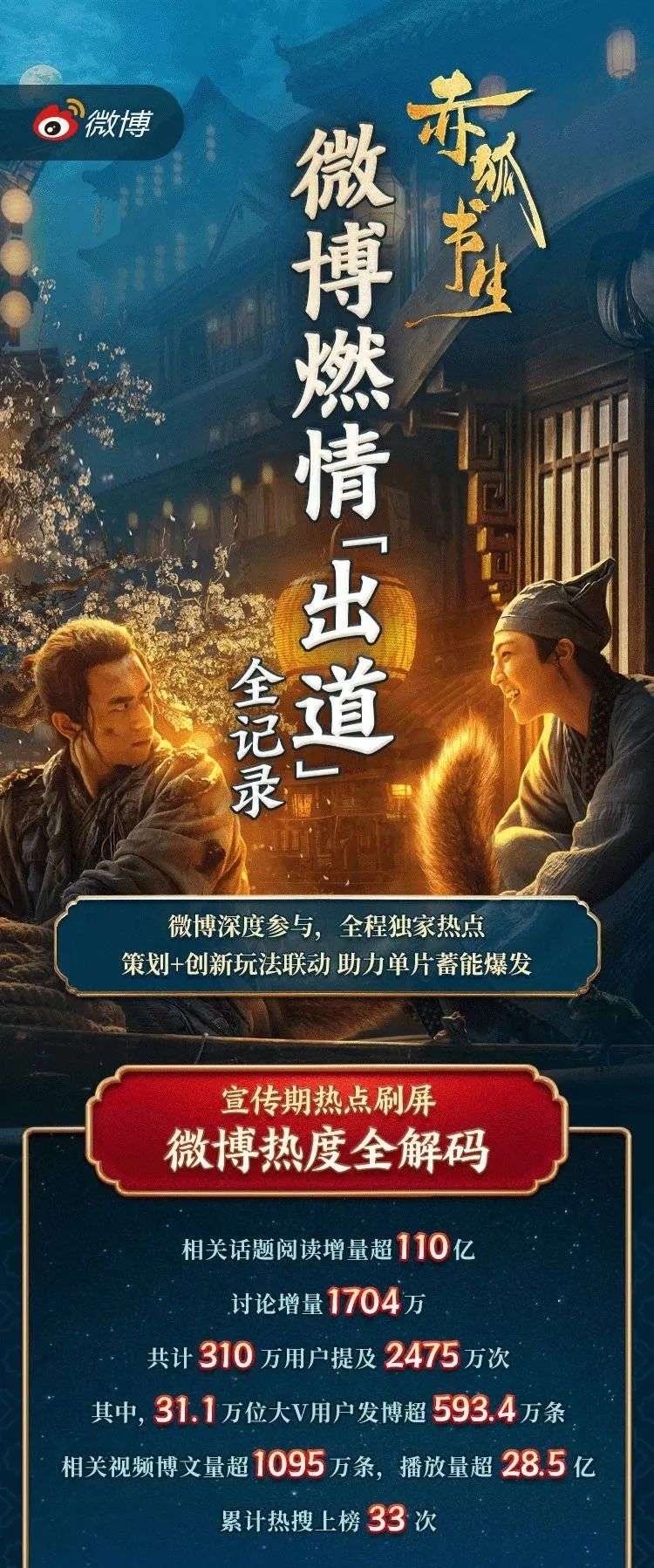 像由易烊千玺主演的元旦档爆款电影《送你一朵小红花》,在宣传阶段投放物料播放量数据优异,相关话题多次登上热搜榜前列。由陈立农、李现主演的奇幻电影《赤狐书生》,也利用制造话题、扫楼宣传、线上直播等宣传方式,为影片增加曝光,相关话题17次登上热搜。
