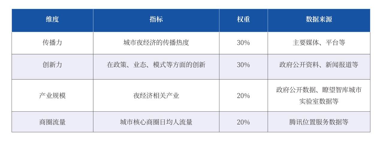 2020年,由瞭望智库、腾讯成立课题组,在对夜经济城市进行大量实地调研的基础上,充分结合大数据等工具,从夜经济传播力、创新力、产业规模、商圈流量四个维度对目标城市进行重点分析,其指标权重分别为30%、30%、20%和20%。
