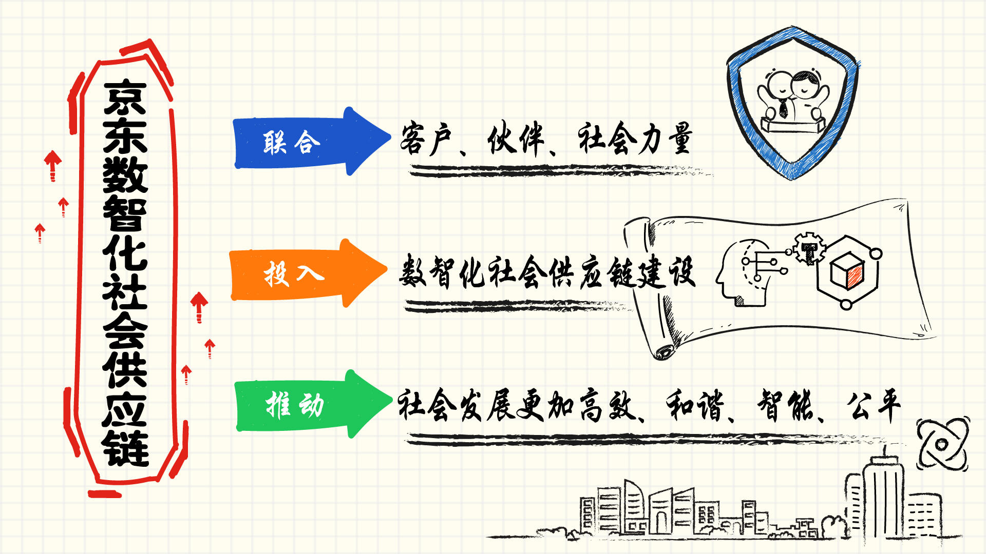 伴随着人工智能、物联网、区块链、自主系统和下一代计算五大关键数智化技术的投入积累与研究,京东结合自身商业场景优势,以京东零售、健康、物流、金融、城市为驱动,链接技术创新与产业供应链全流程,为实现产业数字化转型,赋能数智化社会供应链新业态集中发力。