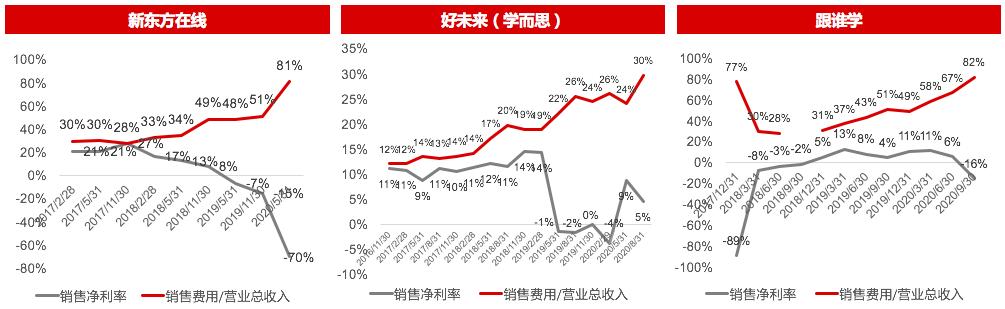 从以往的经营数据来看,营销部分的投入必然是重中之重,并且呈有增无减的趋势。好未来从 2018 年开始加大市场营销投放, 2018 至 2020 财年营销费率从 14.1% 提升至 26%,最新季度财报显示的销售费用占比已超过 30%,而 2020 财年的营销费高达 8.5 亿美元。从新东方在线和跟谁学最近公布的财报来看,销售费用占营业收入比重已超 80%,新东方在线 2020 财年营销费用也高达 8.7 亿人民币,比上一年度翻了将近一倍。