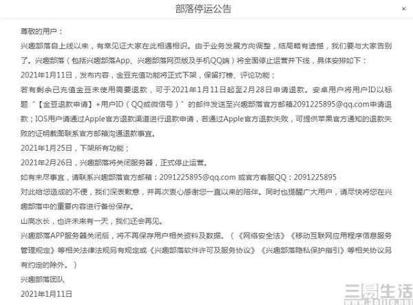 就与其他停运产品一样,QQ兴趣部落的退场同样也是分阶段进行。在该公告中指出,由于业务发展方向调整,兴趣部落(包括兴趣部落App、兴趣部落网页版,以及及手机QQ端)将全面停止运营并下线。1月11日,发布内容与金豆充值功能将下架,保留打榜和评论功能,在1月25日下架所以功能,并于2月26日正式关闭服务器。