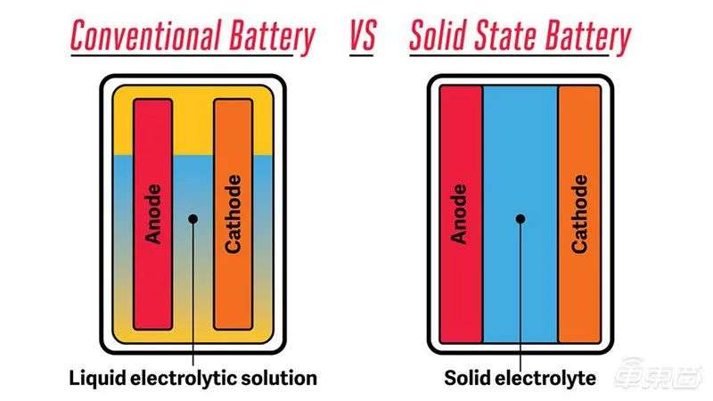 ▲传统电池(左)与固态电池(右)结构原理图对比