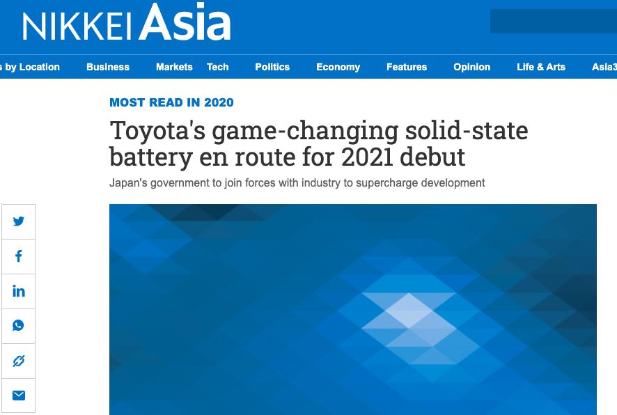 ▲《日经新闻》报道丰田将会在2021年推出固态电池量产车