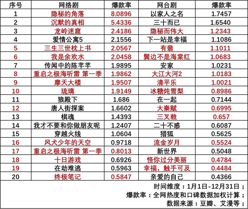 2020年网络剧和台网剧爆款TOP20(标红为文学改编)