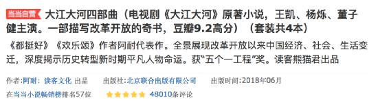 此外,我们了解到,电视剧《大江大河2》宣布定档时间当天,《大江大河》原著当晚就上了当当小说畅销榜。在剧集热播效应的强势拉动下,根据出版方数据,该书今年有声书播放量突破5500万,达到去年同期播放量的近两倍。