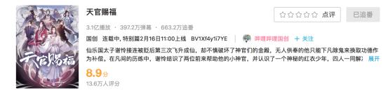 此外,B站独家推出由墨香铜臭的同名小说《天官赐福》,一经播出就引起了强烈反响,在给大家留下深刻印象的同时播放量和追番数也非常亮眼。播出23天,《天官赐福》动画版的播放量就已经破亿了,到了现在追番人数更是超过了500万,成为了目前最炙手可热的作品。