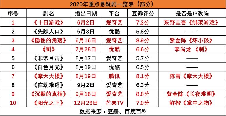 在类型上,悬疑、现实主义IP表现突出。今年是悬疑剧的爆发年,仅仅暑期档三大视频平台就推出9部悬疑短剧集,4部口碑最好的作品都是改编而来,《隐秘的角落》和《沉默的真相》改编自紫金陈小说《坏小孩》和《长夜难明》,《十日游戏》由东野圭吾小说《绑架游戏》改编,《摩天大楼》改编自作家陈雪同名小说。