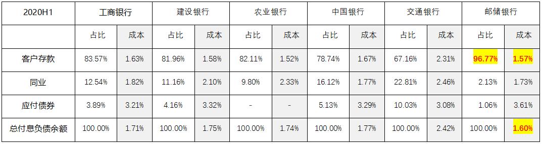 看各家银行用来投放信贷、投资等的“原材料”-付息负债中可以看到,邮储银行的客户存款占比达到97%,其他大行仅为80%左右。有好处也有坏处,好处是“低成本”的存款源源不断,缺点是不符合负债多样化的原则,严重依赖单一渠道。