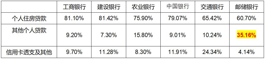 个人贷款的收益率高于公司贷款。邮储银行54%的贷款是投向了个人贷款,高于其他银行20多个百分点,且邮储银行的个人贷款的利率为5.42%,高于传统四大行近60个基点。