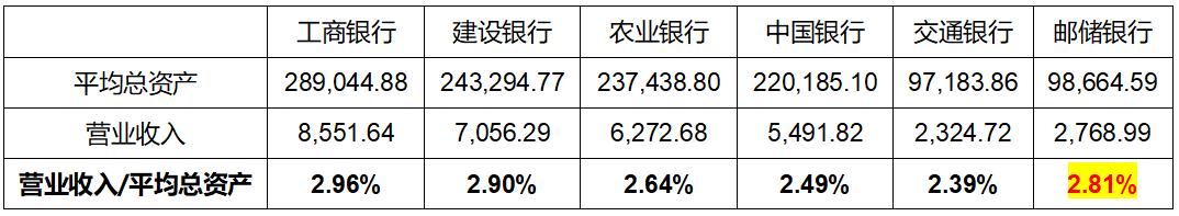 从2019年报来看,邮储银行用平均9.9亿的总资产,产出了2769亿的收入,平均总资产的营收水平是2.81%,营收能力高于农业银行、中国银行,但少于工商银行、建设银行的。不考虑资产的质量,邮储银行并没有出色的资金使用效率。