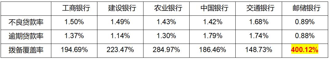 2、 邮储银行的不良率、逾期率是大行中最低的,资产质量高;