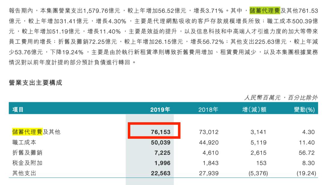 2019年年报显示,邮储银行向母公司支付的代理费达到761.5亿,费率约为1.32%,如果加上这部分费用,邮储的客户存款成本将达到2.39%左右,一点优势也没有,沦落到股份行水平。