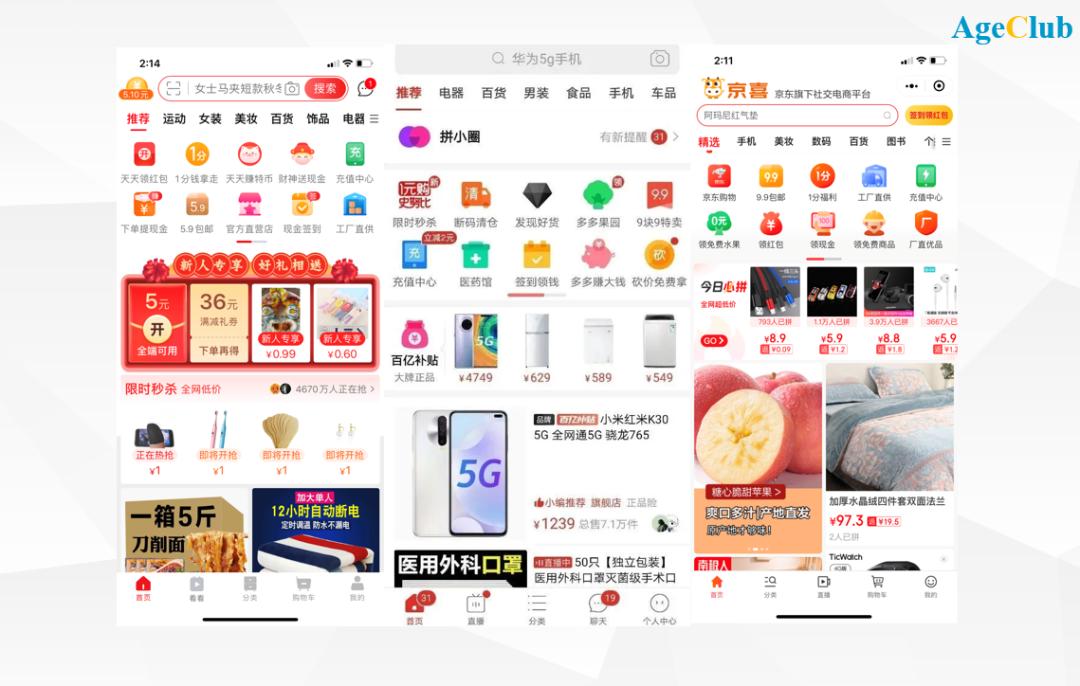 据AgeClub观察,各电商平台基于自己的中老年用户特点做了一些“个性化”设置:
