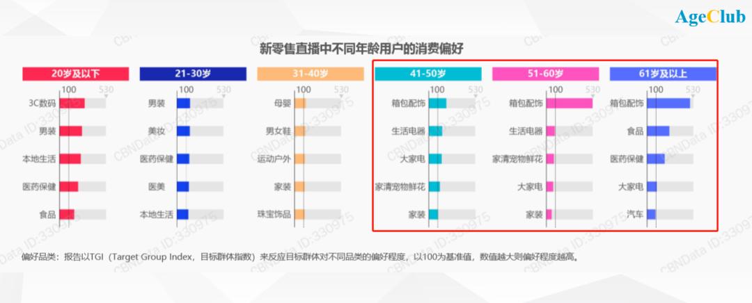 从线下实体零售商家在淘宝线上直播反馈的数据来看,40岁+用户最偏好购买箱包配饰,其次是大家电、生活电器、家装、汽车等家庭消费。中老年用户成为大家电的主力消费群体。