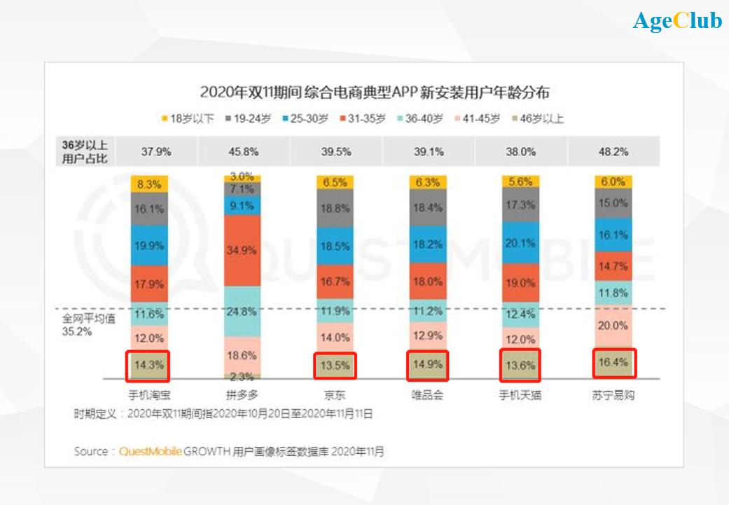参与网购的老年群体更加庞大了。阿里发布的数据显示,一半以上的网购新人年龄超过40岁,其中有近30%在50岁以上。据QuestMobile,2020年双十一期间,手机淘宝、京东、苏宁易购等综合电商,46岁以上用户增幅超过13%。