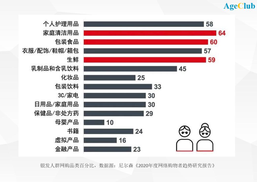 而在其中,生鲜电商的线上用户,60后、70后人群不断提升。一个有力的佐证是,生鲜已经成为银发人群除家庭清洁用品、包装食品以外第三大线上消费品类。