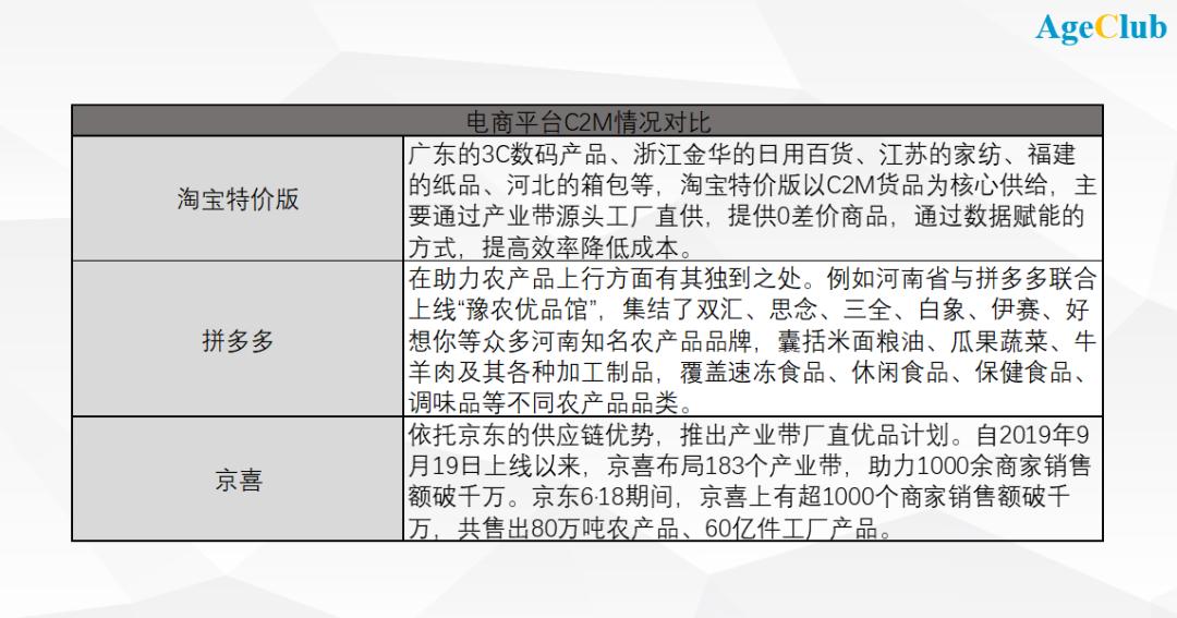 据AgeClub初步统计,目前淘宝特价版、京喜、拼多多运营的主品类主要是家纺、日用品,在此基础上,京东在3C家电品类上具备优势,而拼多多在农产品上吸引力更大。