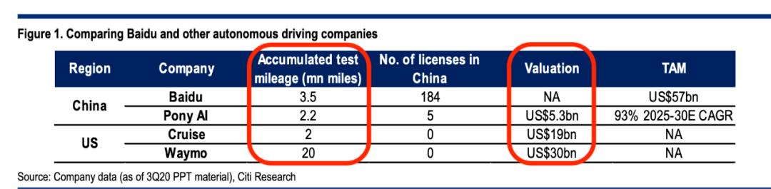 来自雪球用户陈达分享的花旗2020年三季度的研报数据,Waymo当时的估值是300亿美元,Cruise的估值是190亿美元,而190亿这个数字应该是2019年春天、即Cruise再上一轮融资时的数据,花旗没有更新。表格里值得注意的是,对四家公司(包括Pony AI小马智行)无人驾驶累积测试里程数(万英里)的对比,当时百度阿波罗高于Cruise,明显低于Waymo。单从这点看,百度阿波罗的估值应该是可以适当参照Cruise的。