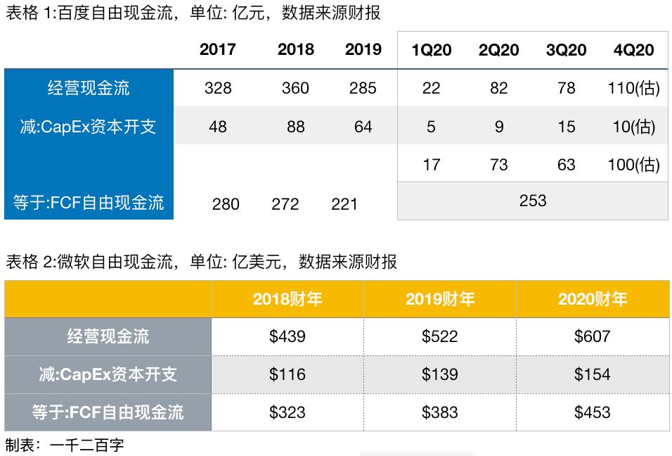 根据百度财报中的现金流量表制作下面这张表格,选取自动驾驶平台Apollo上线的2017年作为起点,年度经营现金流扣除购置设备资产的CapEx资本性开支后(注意这里没有按照新的会计准则同步扣除版权支出),2017-2020年里百度每年的自由现金流FCF在200-300亿人民币之间。由于4Q20季度财报还没出,这里按照历史数据估一个100亿FCF,那么2020全年的FCF大概是253亿,也在这个区间内。
