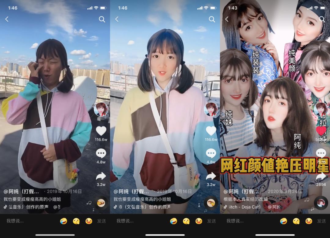 真人,美颜后,精修后. 图片来自:阿纯(抖音)