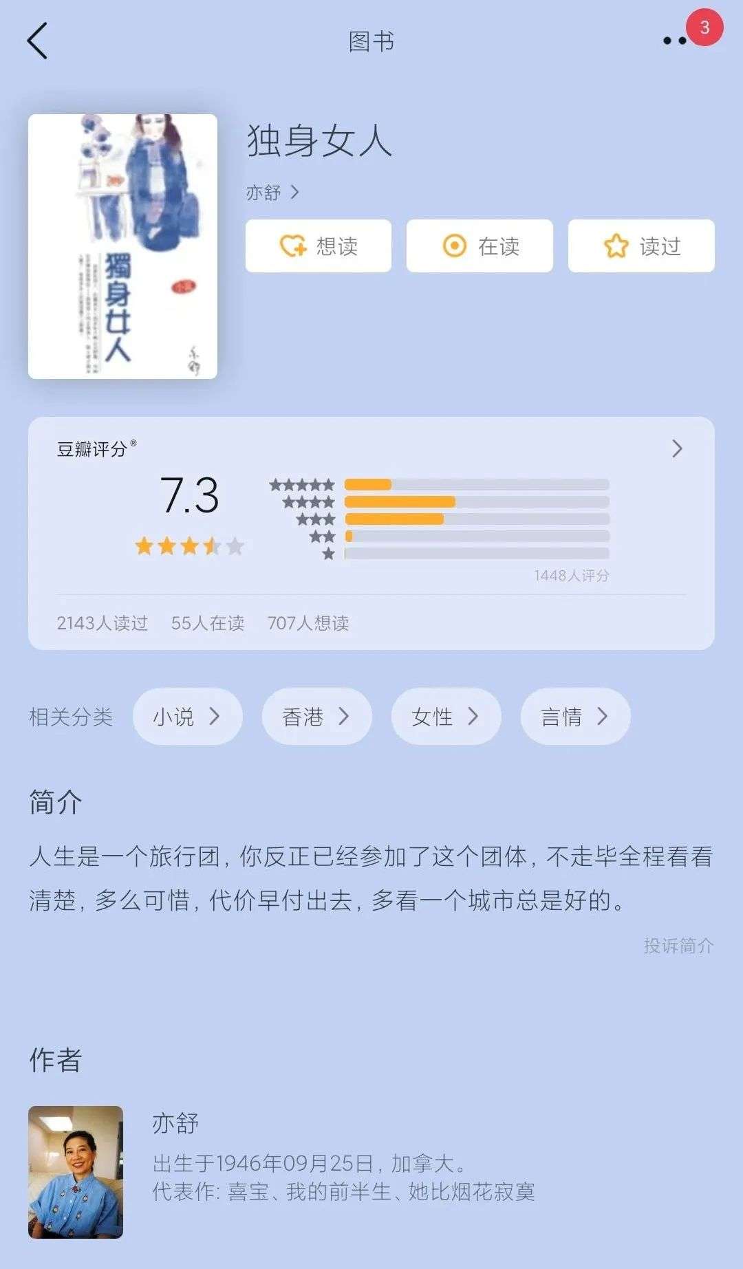 那也是亦舒在内地的第一部影视化作品。很难想象,这个与琼瑶一样被尊为“言情天后”,出版过200余部书籍的IP富矿,在这个多方都在奋力开发IP的年代,却火的这样晚。算上去年改编成电影,由郭采洁主演,豆瓣评分仅有3.5分的《喜宝》,亦舒在内地播出过的只有3部改编作品,《我的前半生》更是亦舒第一部被改为电视剧的作品。