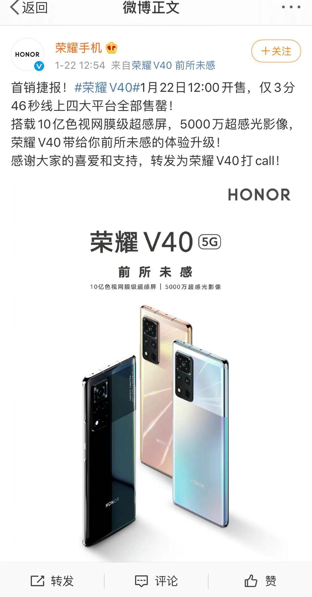 发布会结束后,荣耀手机官博表示,荣耀V40在线上四大平台开售仅3分46秒后售罄。