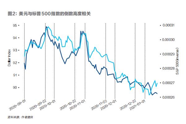 如果把标普500指数作为市场风险偏好的指标,可以看到,自2020年9月至今,美元就与标普500指数的倒数高度相关。也即股市对选举或疫苗的正面反映,均带来美元的下跌。美元与股市的关系最近出现小幅偏离,源于美国国债收益率上升。但美联储并没有任何迹象表明要退出宽松政策,而且这种偏离属于正常范围,有望在未来再次回归。