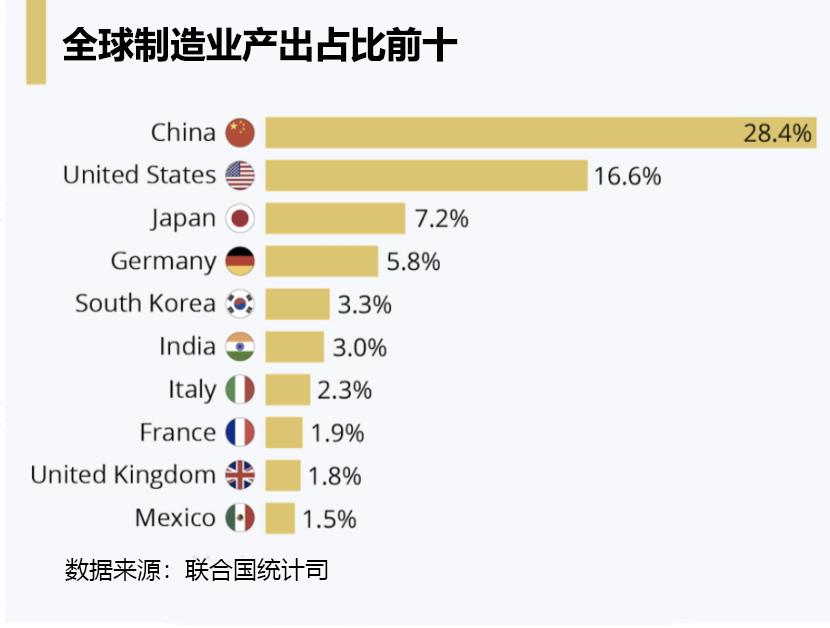 在数据上,这个观点也并非没有例证,联合国统计司数据显示:2018年全年,中国占全球制造业产出的28%,比美国领先了10个百分点。