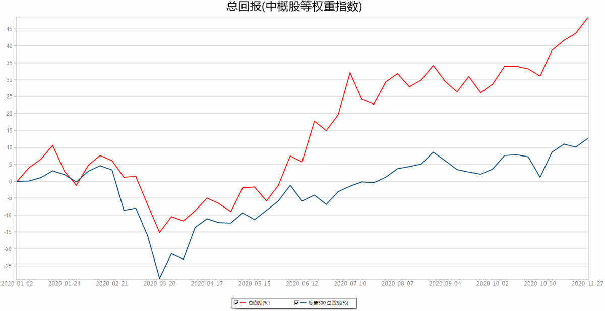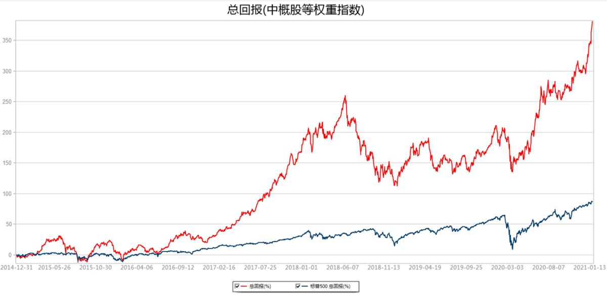 2015年1月1日以来中概股等权重指数上涨381.04%,大幅跑赢标普500指数,相对回报率为294.46%。