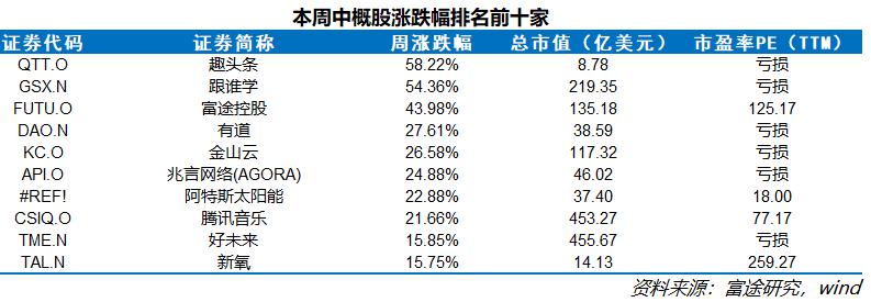 热门中概本周普涨,大幅跑赢标普500指数。行业方面,受到局部疫情反复影响,本周跟谁学、好未来、有道等在线教育公司股价上涨明显。此外,与「宅经济」相关的资讯、在线娱乐、电商行业均有反弹,其中趣头条本周上涨近58.22%,拼多多与阿里巴巴上涨近6%。