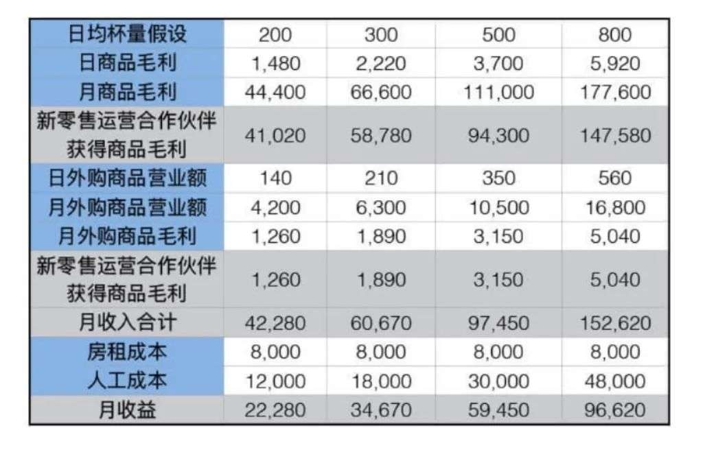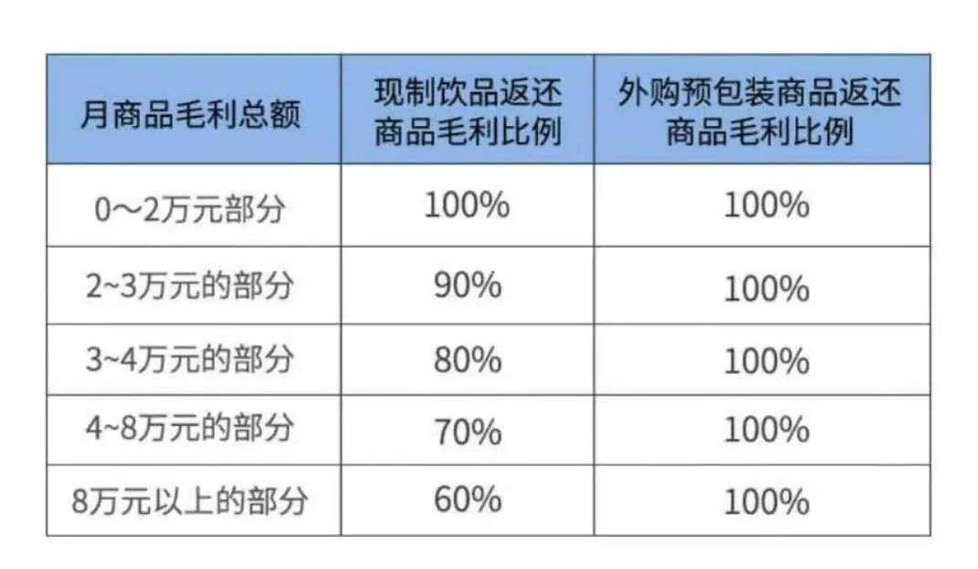 在收益政策方面瑞幸将门店的毛利总额分为5档,并以实际售价14元每杯,原料成本6.6元每杯进行测算,月毛利不超过2万元,扣除原料费用后收益全额返还给合作伙伴。