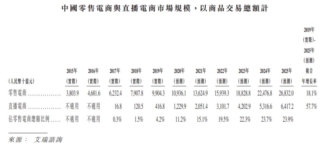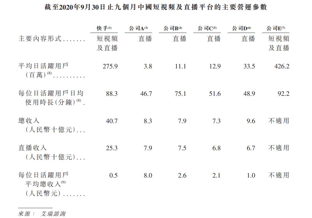 根据艾瑞注释,公司E是中国的一组迎合多元化社交及娱乐用户案例的私营短视频及直播应用程序。由于公司E 为私营企业,艾瑞咨询无法可靠估计其总收入、直播收入及每位日活跃用户平均总收入。明眼人一看就知道,公司E就是抖音了。