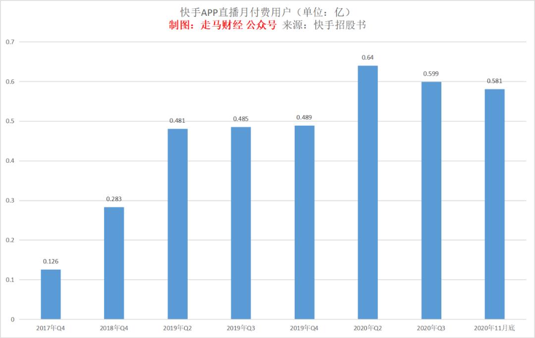 直播可以说是快手最早一块开始商业化探索的业务了,2017年就有了1260万月度直播付费用户,经过3年的发展,直播业务已经进入成熟期,我们看他的付费用户增长率就能看出来,2018年增速124.6%,2019年增速72.8%,2020年截至11月底增速18.8%。